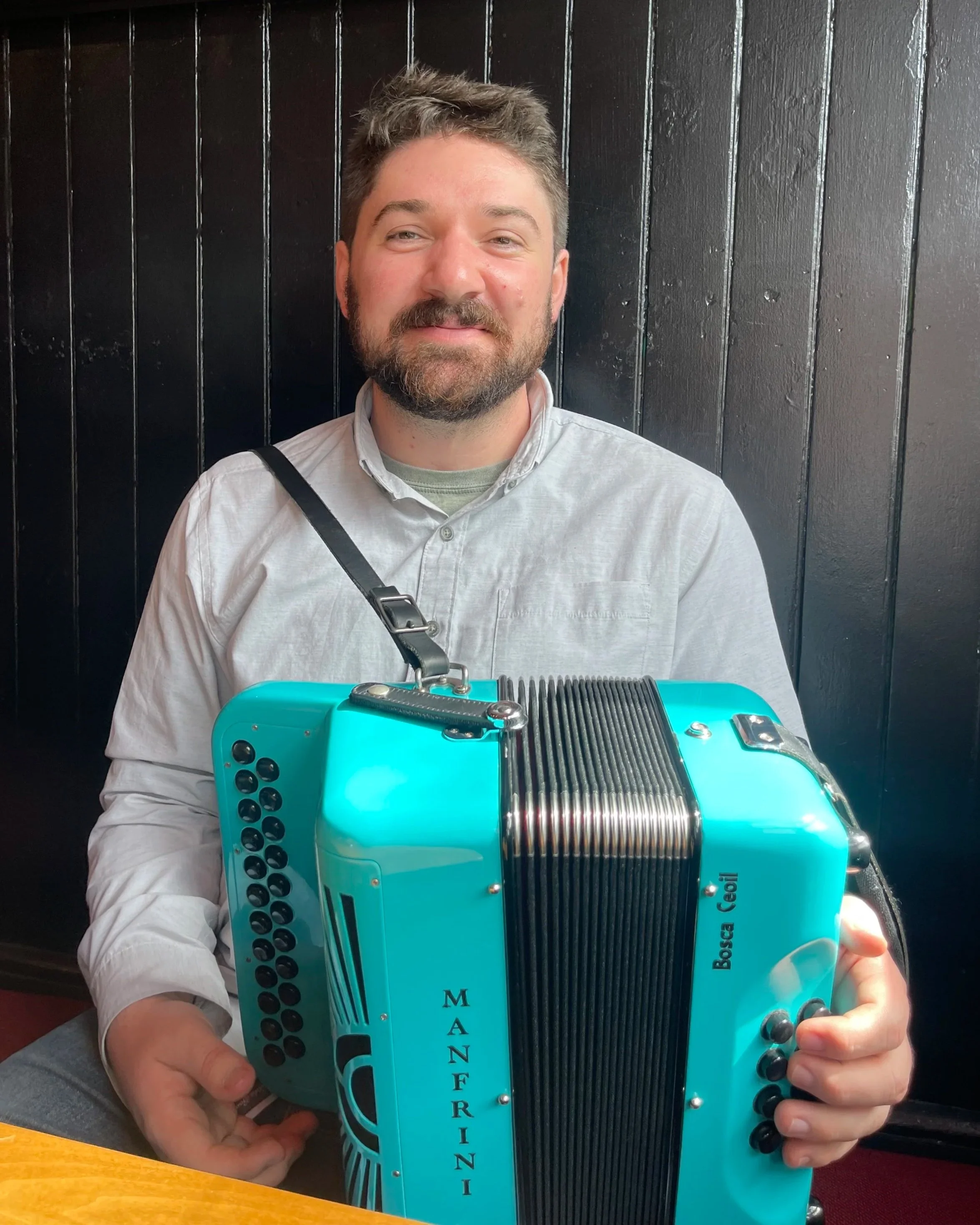 Colin Kadis (music) is an accordion-player from Boston, MA. He first encountered traditional Irish culture through his grandfather, a poet, who grew up in Queens, NY in the 1930’s and imparted a reverence for older styles of Irish music, having heard Michael Coleman play live as a child and been born to parents from Ballydesmond, Co. Cork and Castleisland, Co. Kerry in the Sliabh Luachra musical tradition. Growing up in Boston, Colin had the opportunity to learn music, philosophy, and stories from local musicians like Tommy Sheridan and Sean McKiernan. Time spent in Ireland, Vermont, Chicago, Ithaca, and later Vancouver BC have created opportunities for further influences. His focus within Irish music lies on personal styles and their ability to impart a musician’s own personality. In particular he has spent considerable time researching and analyzing the music of Joe Cooley, Padraig O’Keefe, Molly Myers Murphy, and Nell Galvin. He is one of the organizers of the Northeast Tionól, an October piping event in the Catskills Mountains in New York, and Tunes on the Charles, an Irish music festival in Boston. Colin has competed and/or won medals in several Comhaltas competitions and was selected as a finalist in the Sean Ó Riada Bonn Óir competition in 2026.